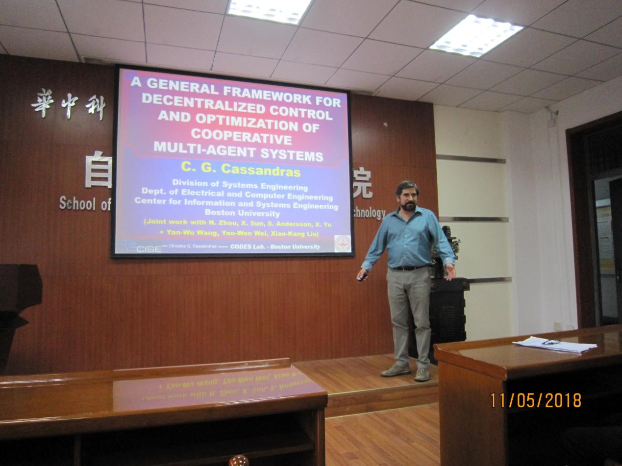 5月11日上午,波士顿大学( Boston University)杰出教授、IEEE和IFAC院士Christos G. Cassandras博士应关治洪教授邀请来新葡的京官网进行学术交流,并作了题为“A General Framework for Decentralized Control and Optimization of Cooperative Multi-agent Systems”的学术报告。报告会由关治洪教授主持,我校教师王燕舞、刘智伟、池明、胡滨等30多位师生参加了报告会。